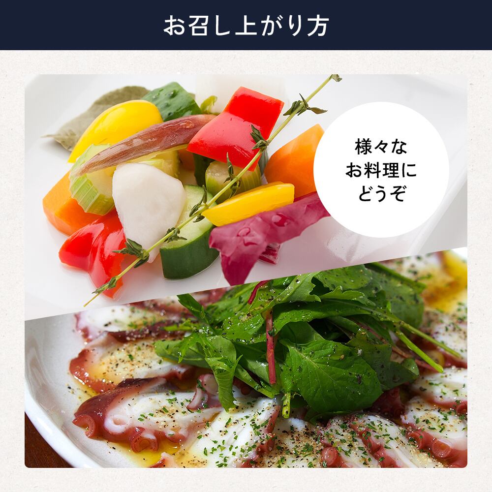 マリネやサラダ、ピクルス、カルパッチョから、和の酢の物など毎日の家庭料理に使えて、重宝間違いなし。